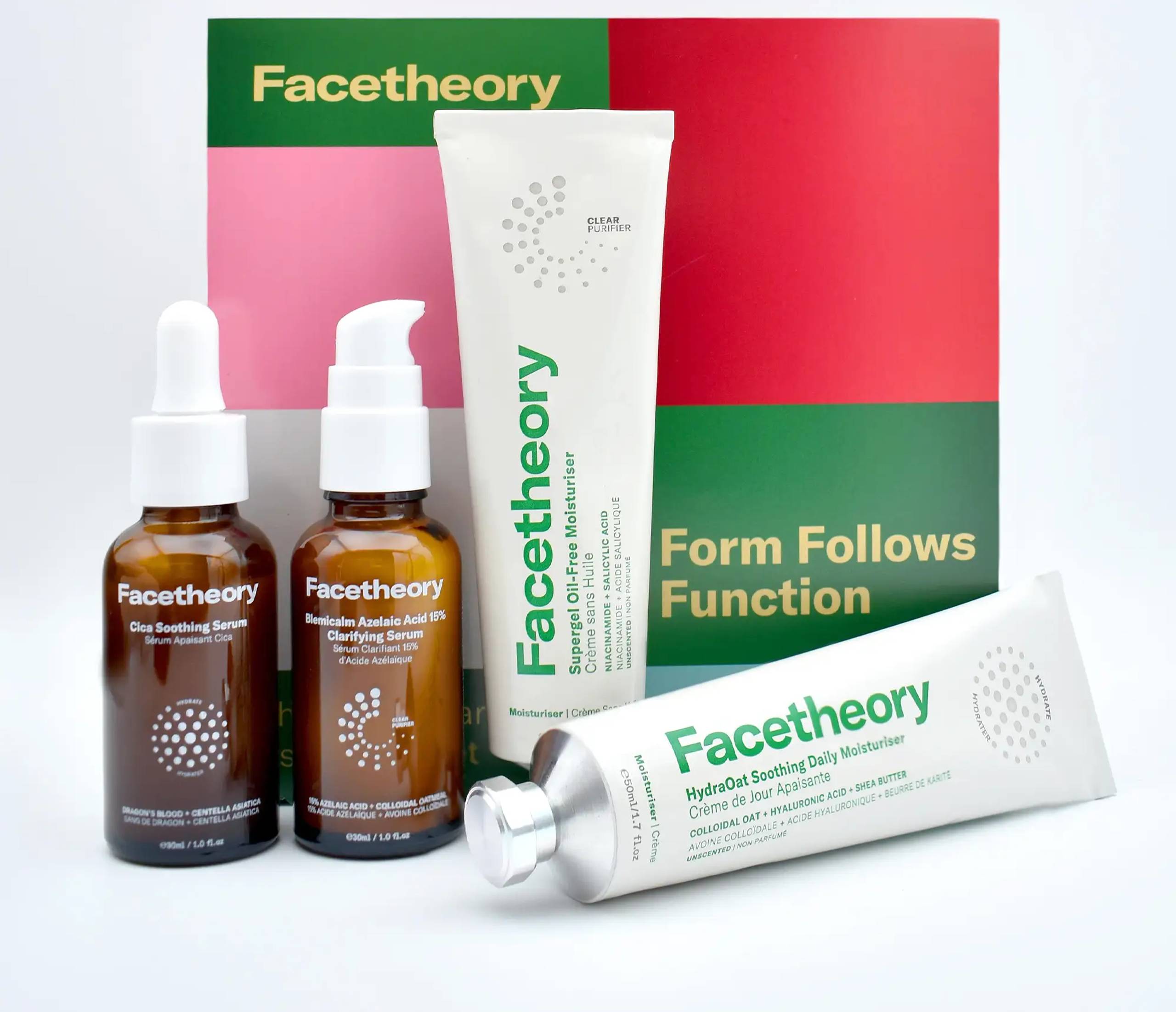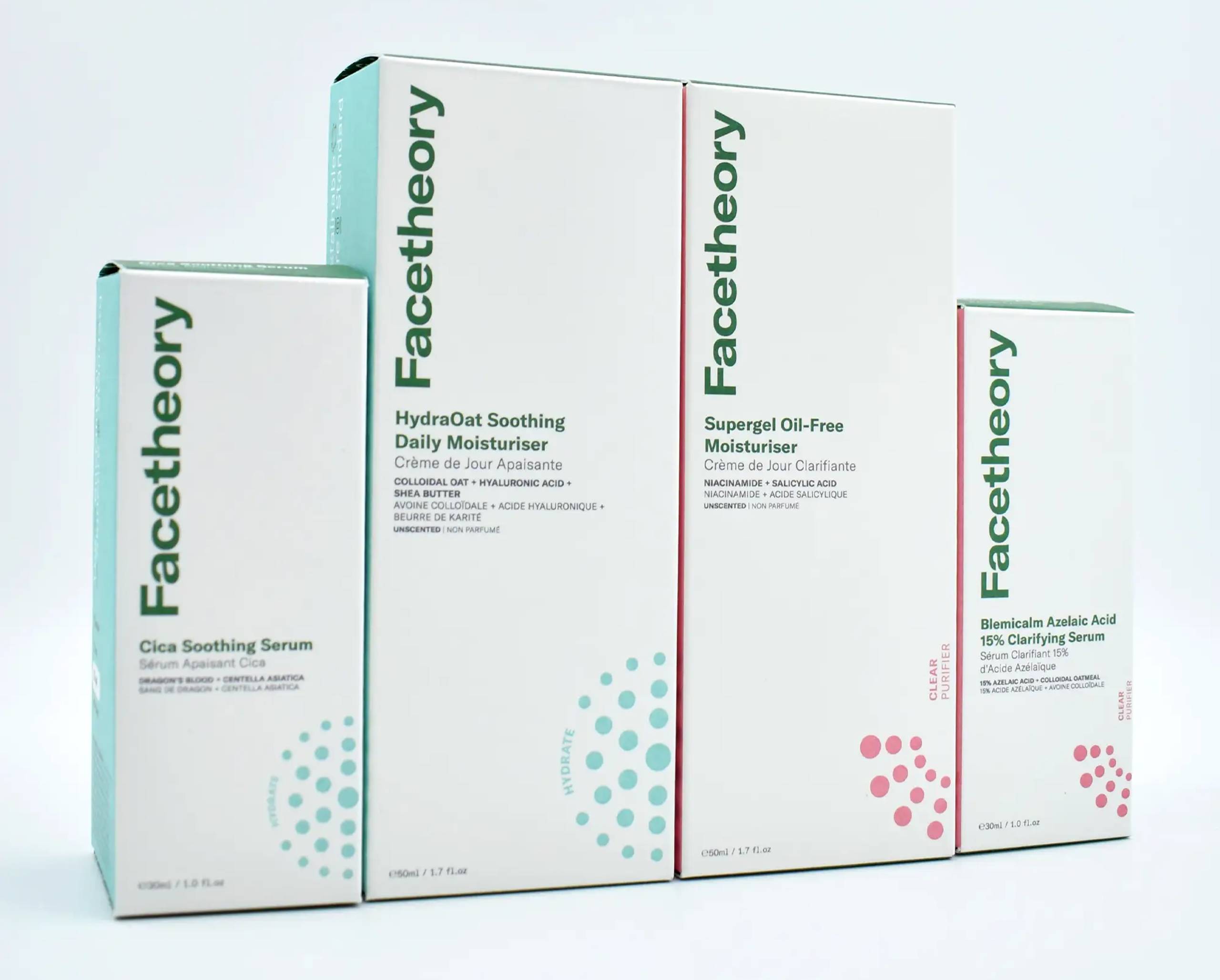 Contains four full size products: Cica Soothing Serum (30ml), HydraOat Soothing Daily Moisturiser (Mandarin, 50ml), Blemicalm Azelaic Acid 15% Clarifying Serum (30ml), Supergel Oil-Free Moisturiser (Unscented, 50ml)