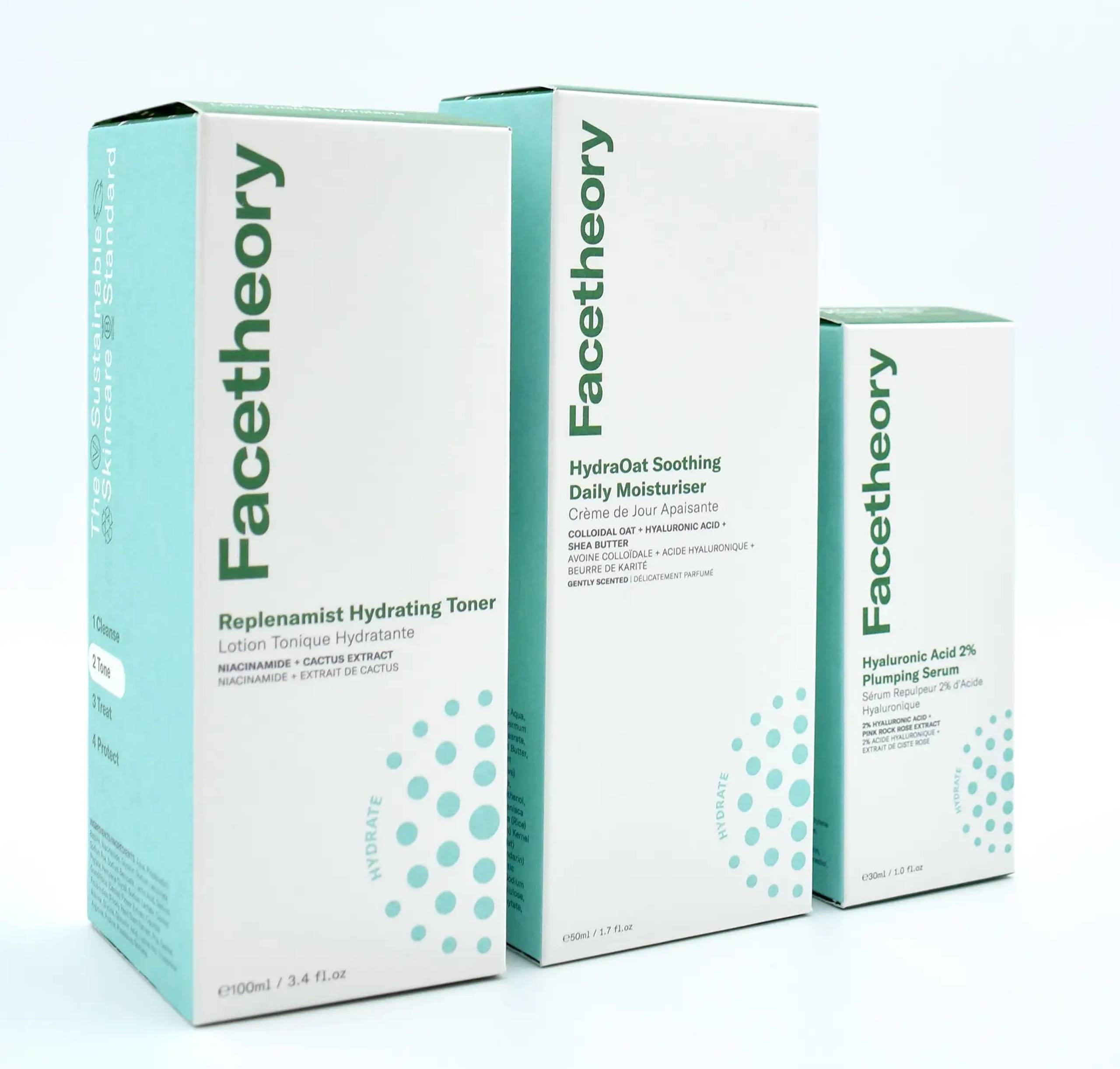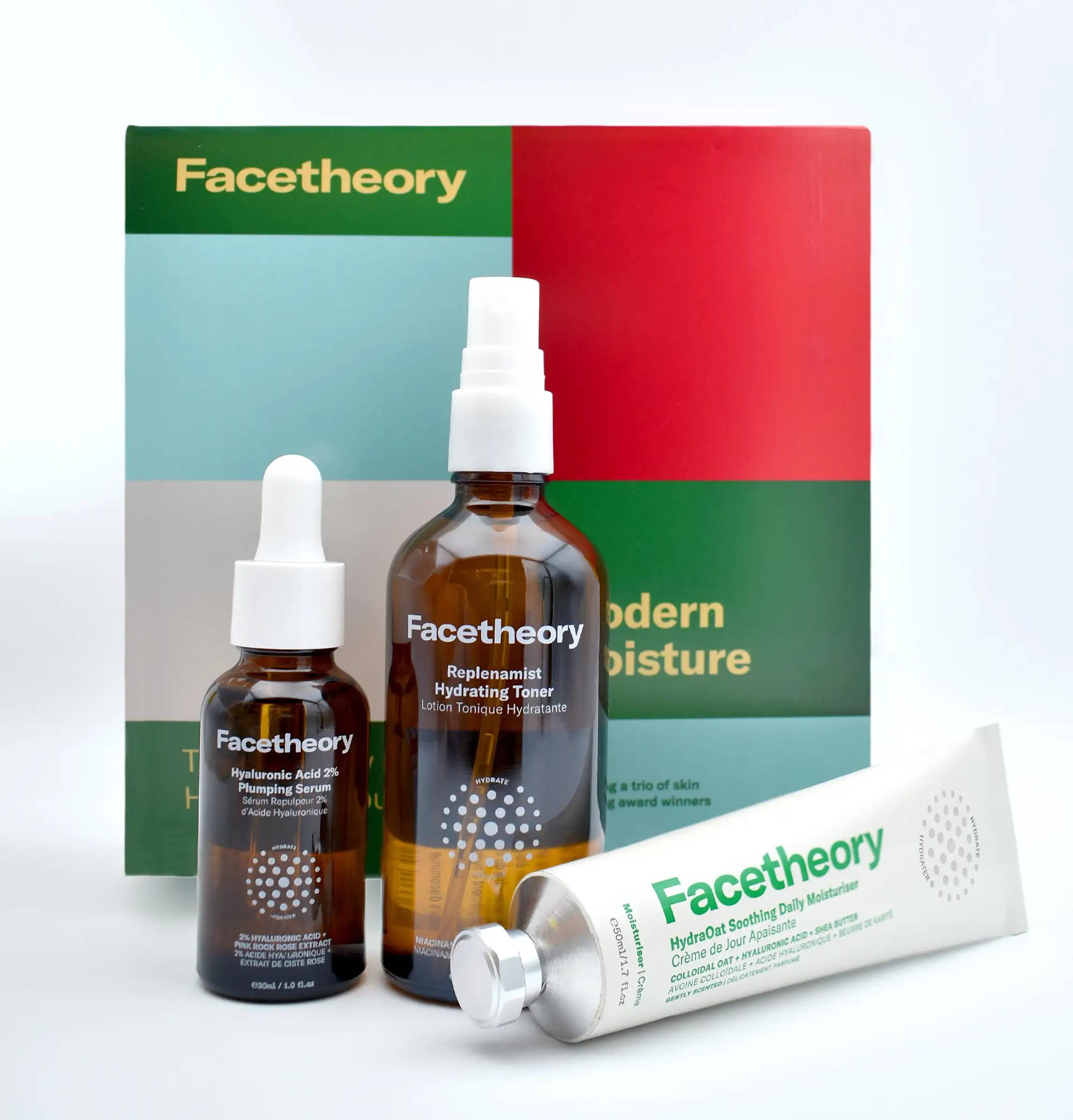 Contains three full size products: Replenamist Hydrating Toner (100ml), Hyaluronic Acid 2% Plumping Serum (30ml), HydraOat Soothing Daily Moisturiser (Mandarin scented, 50ml)