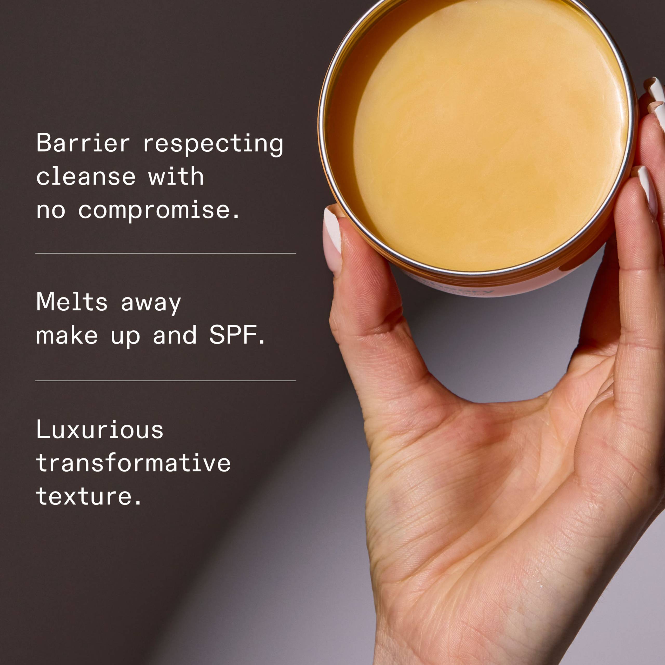 The balm transforms into a silky oil, then a soothing milk that rinses completely clean without tightness or residue.